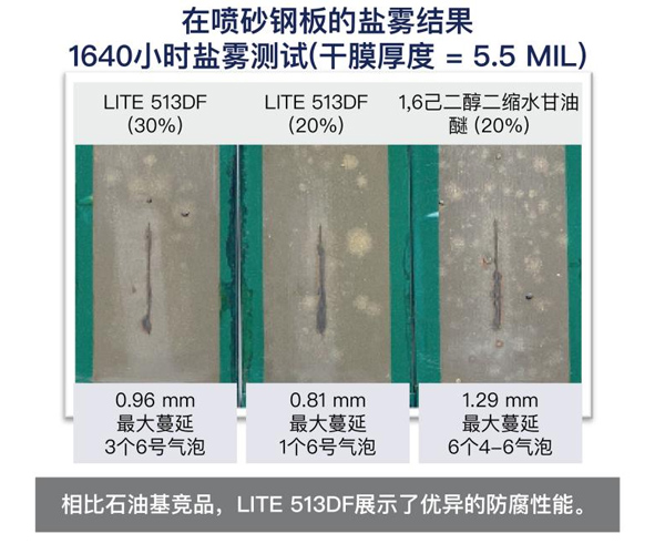 lite 513df是一款基于腰果殼油的新型高生物含量稀釋劑,它的環(huán)氧當量比標準的513型號要低。這款產(chǎn)品適用于環(huán)氧涂料、單組分和雙組分粘合劑以及復合材料。lite 513df粘度低,具有優(yōu)異的稀釋能力,與雙酚a型液體環(huán)氧樹脂的添加重量曲線如圖所示。作為稀釋劑,它在環(huán)境溫度和低溫下具有良好的硬度發(fā)展。與其他腰果殼油改性的材料類似,lite 513df具有良好的耐水性和柔韌性。在涂料應用中,lite 513df在長期鹽霧試驗中表現(xiàn)出非常好的防腐性能,請見本頁面板的圖片。在粘合劑應用中,這種環(huán)氧稀釋劑還可作為改性劑,提高伸長率和粘結(jié)強度,同時將對tg和抗拉強度的影響降至低。