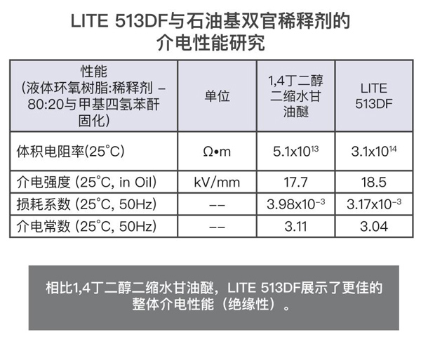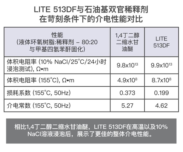 根據(jù)iec 62631和iec 60243標準進行測試,如其介電性能所示,lite 513df提供了良好的絕緣性能。在epon 828的配方中,樹脂的使用量為20%,用mthpa(甲基四氫鄰苯二甲酸酐)固化,并用bdma(芐基二甲胺)催化。lite 513df展示了優(yōu)異的結(jié)果,其體積電阻率和介電強度更高,損耗因數(shù)和介電常數(shù)比競品1,4丁二醇二縮水甘油醚更低。當兩種稀釋環(huán)氧樹脂體系都暴露于高溫或鹽溶液中時,lite 513df的性能優(yōu)于石油基雙官能稀釋劑。lite 513df是一款良好的環(huán)氧稀釋劑和改性劑,適用于電氣灌封、鑄造和封裝(浸漬樹脂)。